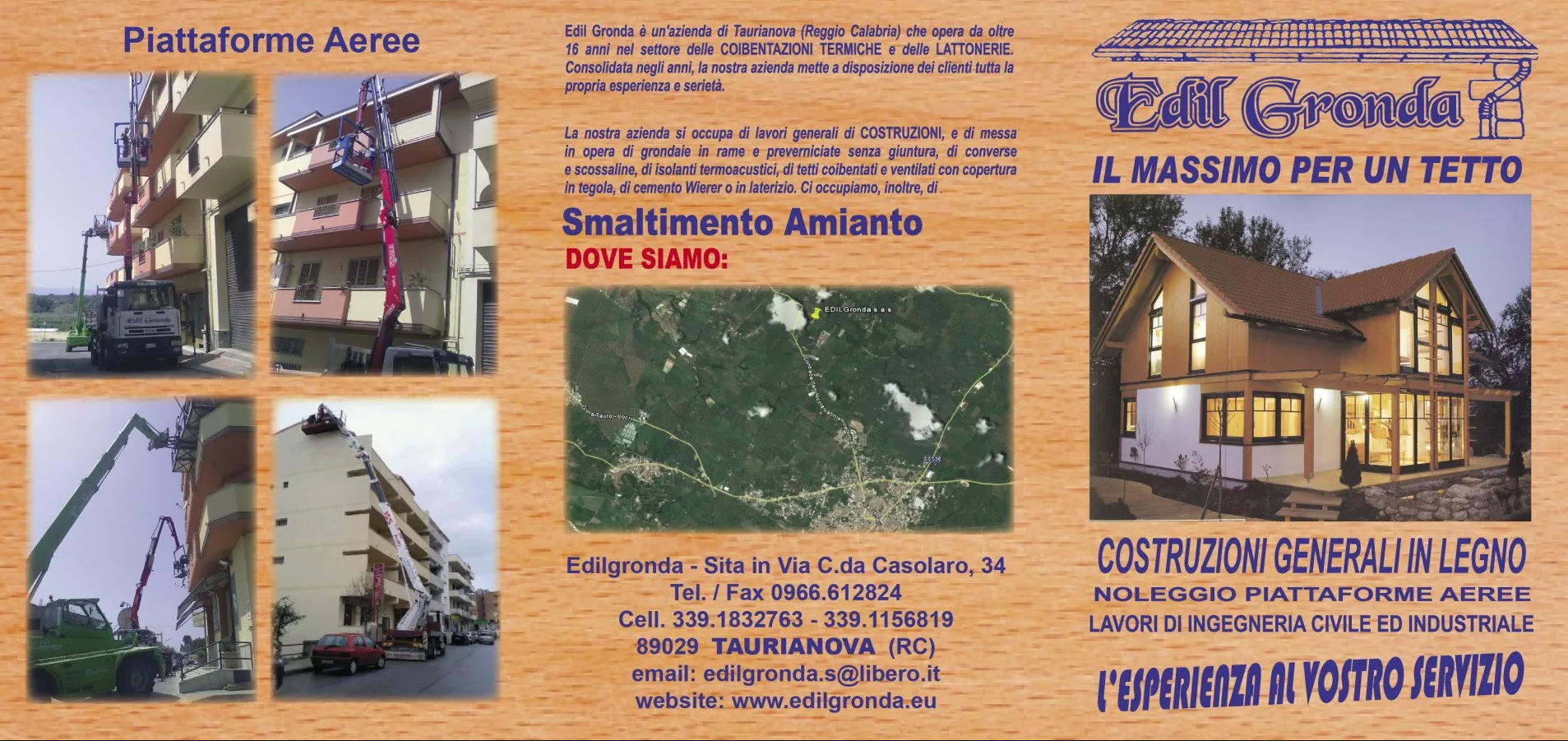 Aperti dal 2000, Edil Gronda si occupa di lavori generali di costruzioni, lavori di ingegneria civile e messa in opera di grondaie in rame e preverniciate senza giunture in alluminio, converse e scossaline, isolanti termoacustici, tetti coibentati e ventilati con copertura in tegola cemento wirer o in laterizio (toscano−fiorentino). La ditta è a disposizione per il noleggio di piattaforme aeree per la sostituzione e il rifacimento di grondaie, la potatura di alberi, interventi rapidi su varie altezze, manutenzione d'impianti, illuminazione pubblica e interventi dove non è possibile montare ponteggi.